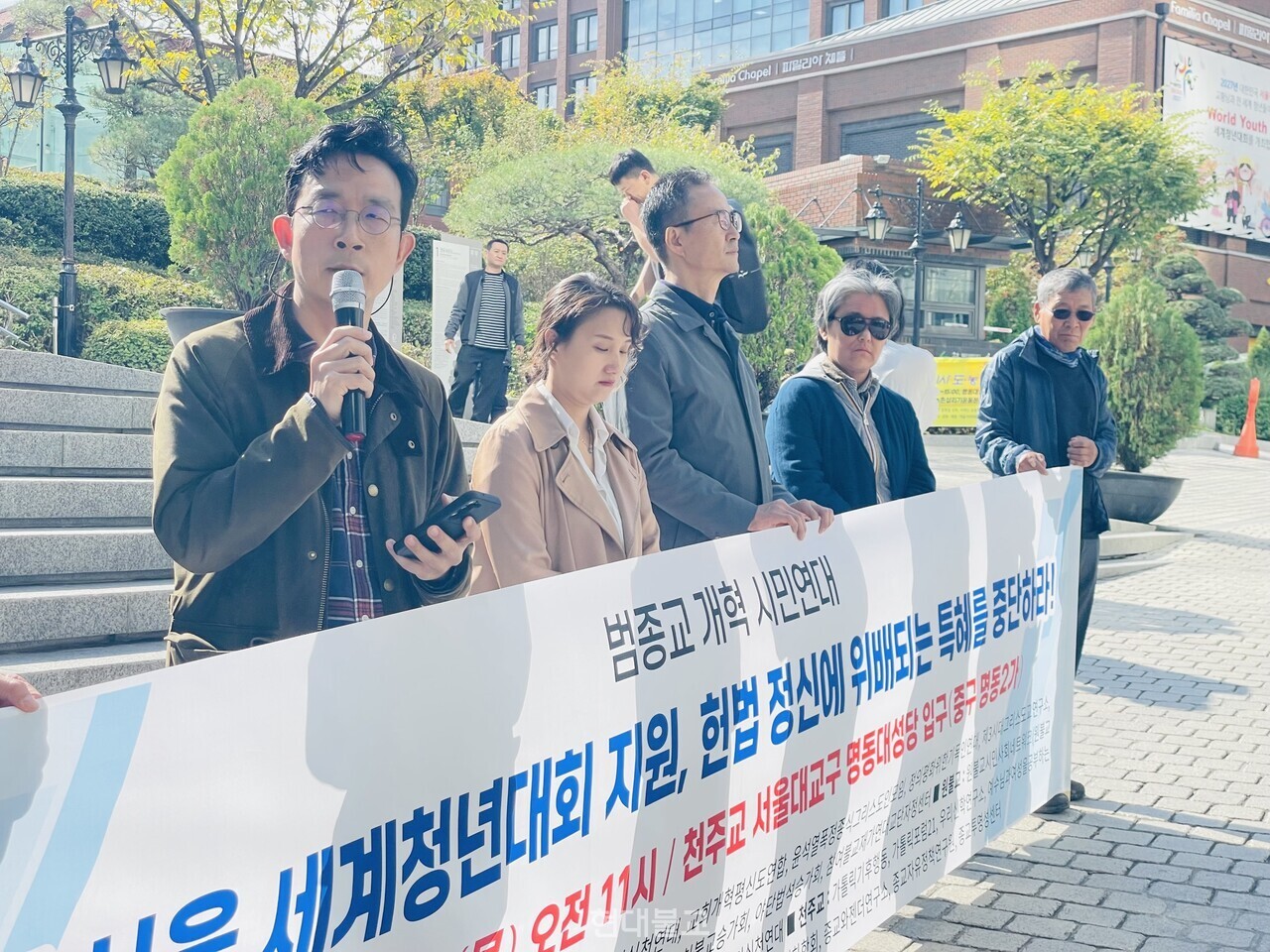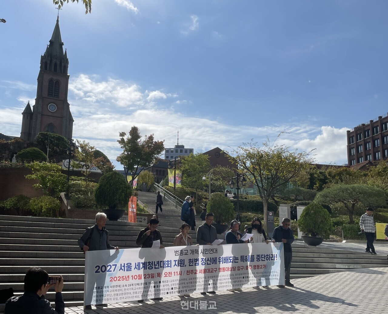 국내 5대 종단 및 시민사회 28개 단체로 구성된 범종교개혁시민연대는 10월 23일 천주교 서울대교구 주교좌명동대성당 입구에서 ‘2027 서울 세계청년대회 특혜 중단 촉구 기자회견’을 열고 “헌법 정신에 위배되는 특혜를 중단하라”고 목소리를 높였다.